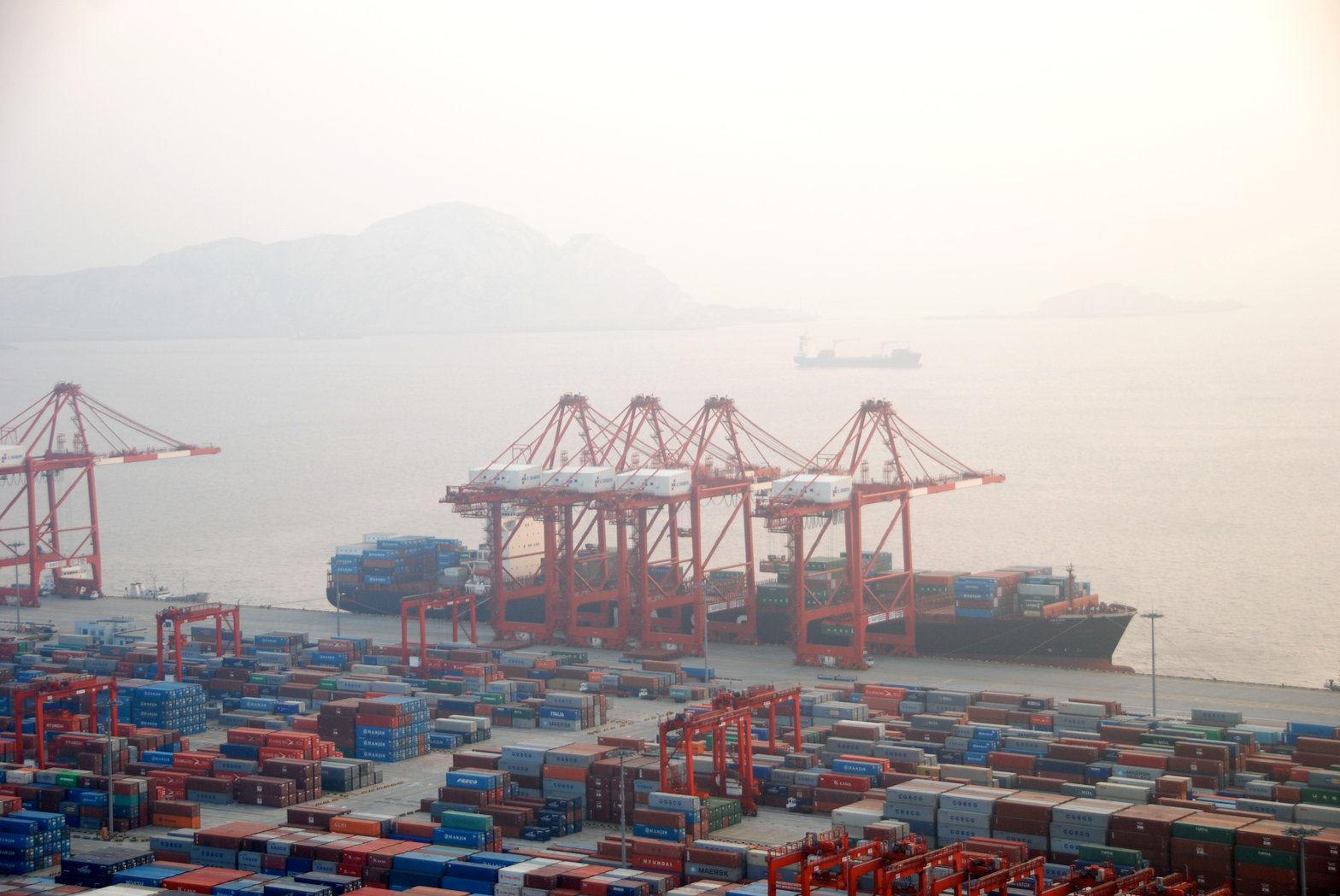 Chargement d’un porte-conteneurs dans le port en eaux profondes de Shangai Yangshan. © Bert Van Dijk sur Flickr