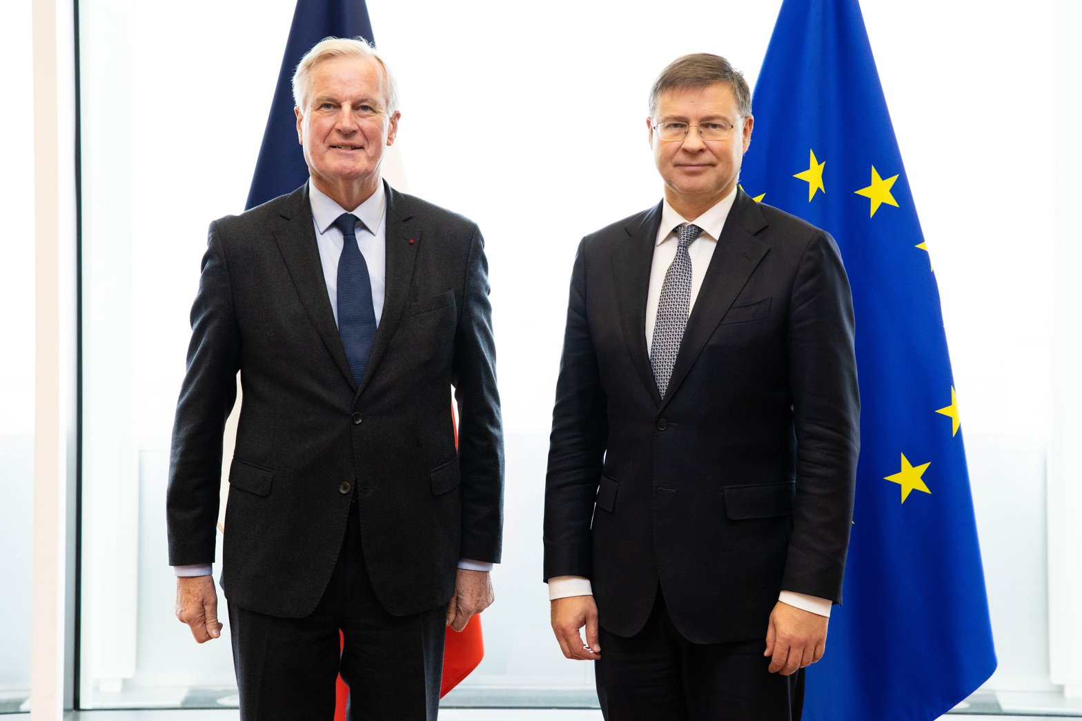 Michel Barnier, Premier ministre français avec Valdis Dombrovskis, commissaire européen au Commerce, le 13 novembre 2024. © Commission européenne
